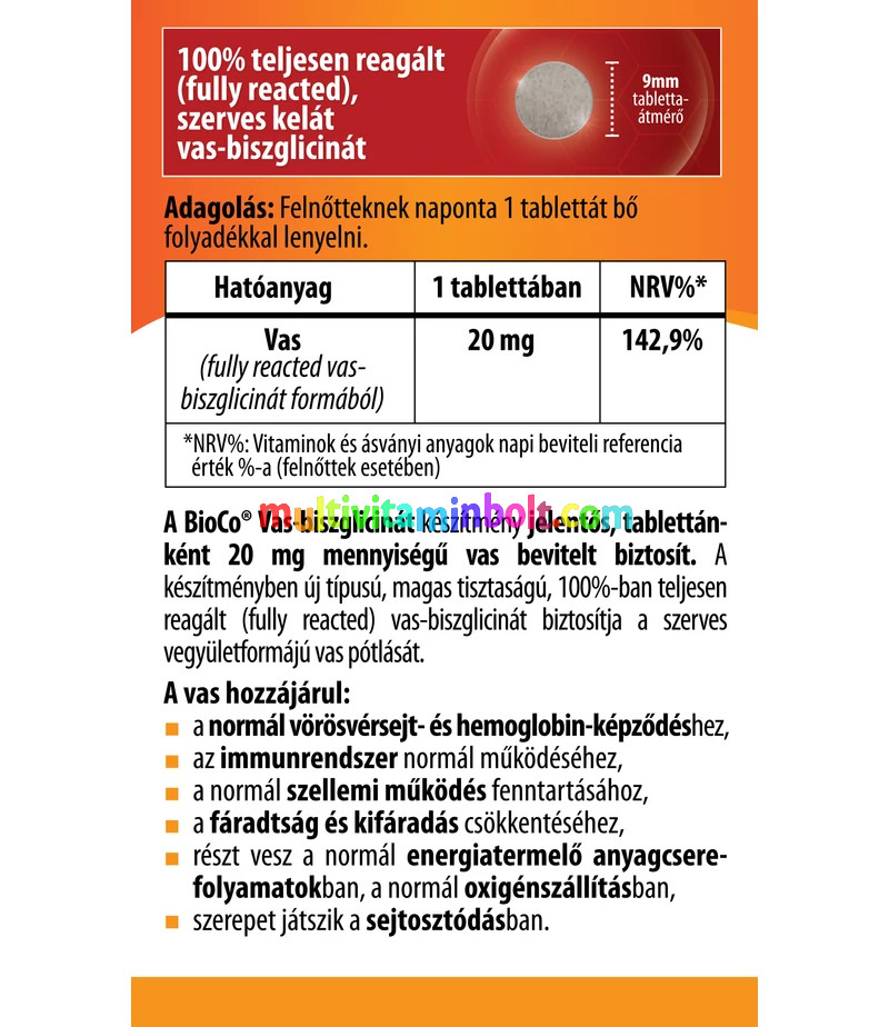 Összetevők: tömegnövelő szer (mikrokristályos cellulóz); vas-biszglicinát; csomósodást gátló anyagok (szilícium-dioxid, zsírsavak magnéziumsói)