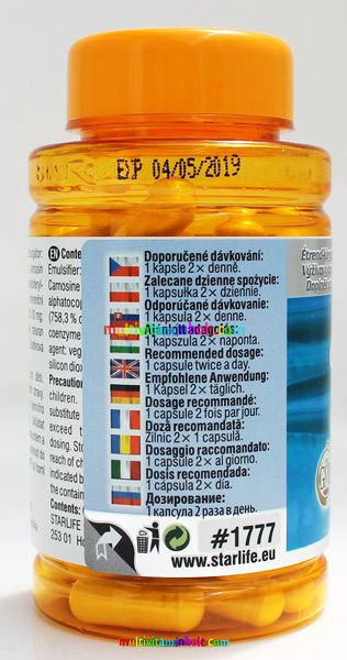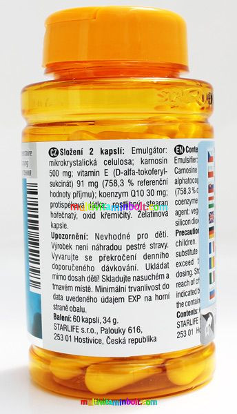 Összetevők 2 kapszulában: tömegnövelő szer (mikrokristályos cellulóz); karnozin 500 mg; E-vitamin (D-alfa-tokoferil-szukcinát) 91 mg (758,3 % NRV*); Q10 koenzim 30 mg; csomósodást gátlók (szilícium-dioxid, magnézium-sztearát). Zselatin kapszula. NRV* = napi bevitel referenciaértéke