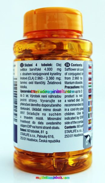 Összetevők 4 kapszulában: Sáfrányos szeklice olaj 4.000 mg: 2.960 - 3.360 mg konjugált linolsav (CLA) tartalommal; színezék: titán-dioxid. Zselatin kapszula.