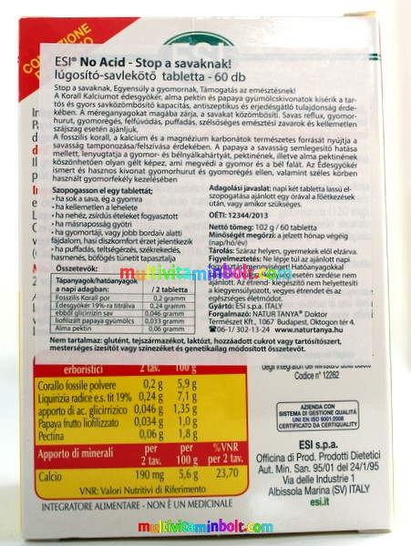 Édegyökér, kalcium, fosszilis korall, alma-pektin és liofilizált papaya tartalmú étrend-kiegészítő tabletta édesítőszerrel.