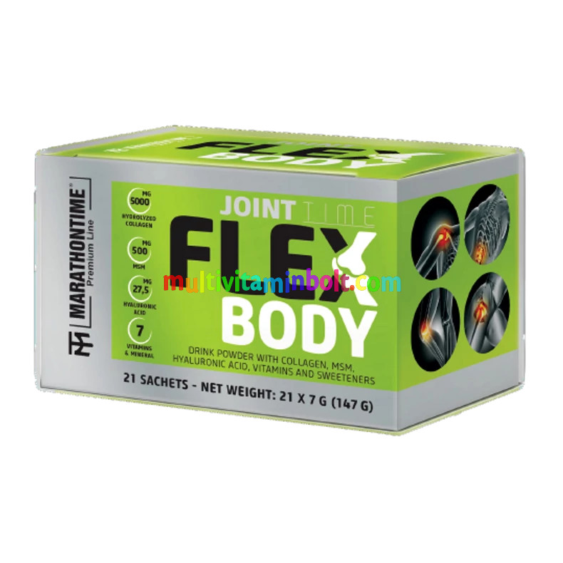 A Flex-body magas hatékonyságú, vitaminnal dúsított, finom kakaó ízű kollagén italpor. 1 tasak elfogyasztása felér 30 db kollagén tartalmú kapszula bevételével, tehát a Flex-body 30-szor erősebb, mint a hagyományos kollagén kapszulák! A Flex-body Kitűnő felszívódású hidrolizált kollagént előállításával készül, egy egyedülálló, speciális eljárással (szigorúan ellenőrzött gyártási folyamatban). A Flex-bodyt magnéziummal és B vitaminokkal, hyaluronsavval, K2 és D3 vitaminokkal és C vitaminnal dúsítják, és kakaóval, xylit-tel ízesítik. A Flex-body cukormentes.