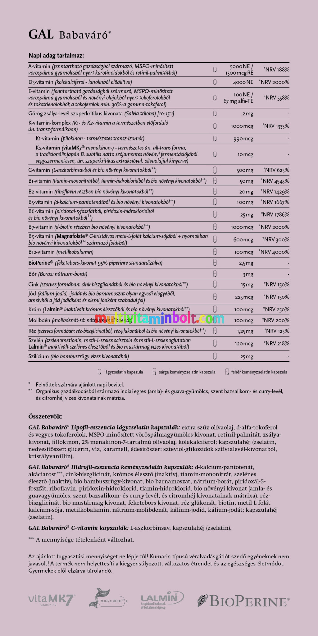 GAL Babaváró® Hidrofil-esszencia keményzselatin kapszulák: d-kalcium-pantotenát, akáciarost***, cink-biszglicinát, krómos élesztő (inaktív), tiamin-mononitrát, szelénes élesztő (inaktív), bio bambuszrügy-kivonat, bio barnamoszat, nátrium-borát, piridoxál-5-foszfát, riboflavin, piridoxin-hidroklorid, tiamin-hidroklorid, bio növényi kivonat (amla- és guava-gyümölcs, szent bazsalikom- és curry-levél, és citromhéj vizes kivonatainak mátrixa), réz-biszglicinát, bio mustármag-kivonat, feketebors-kivonat, réz-glükonát, biotin, metil-L-folát kalcium sója, metilkobalamin, nátrium-molibdenát, kálium-jodid, kálium-jodát; kapszulahéj: zselatin