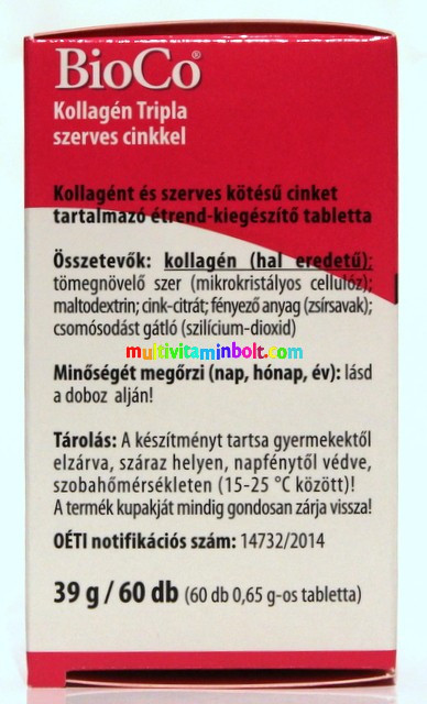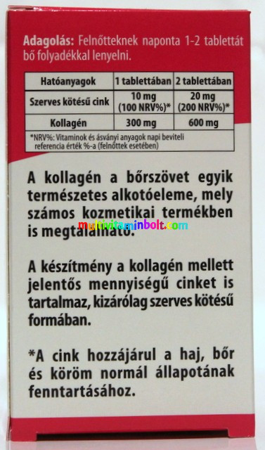 Összetevők: kollagén (hal eredetű); tömegnövelő szer (mikrokristályos cellulóz); maltodextrin; cink-citrát; fényező anyag (sztearinsav); csomósodást gátló (szilícium-dioxid)