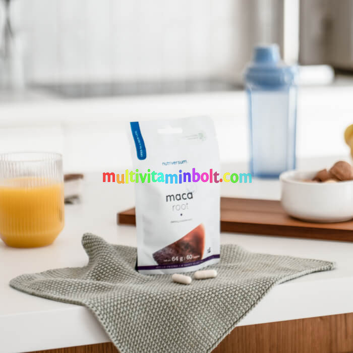 Macagyökér-por-tartalmú étrend-kiegészítő kapszula.
